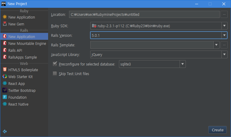 세팅 완료 아래 Create버튼으로 프로젝트 시작