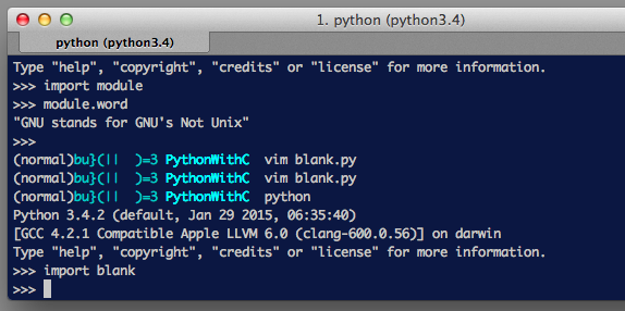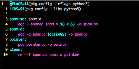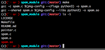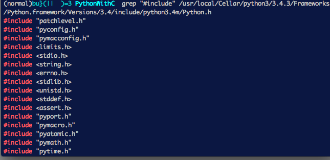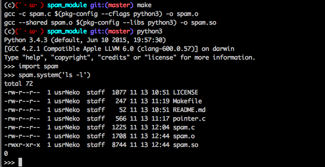 gcc -c spam.c -I/usr/local/Cellar/python3/3.4.3/Frameworks/Python.framework/Versions/3.4/include/python3.4m -o spam.o毎回書くのだるくね?