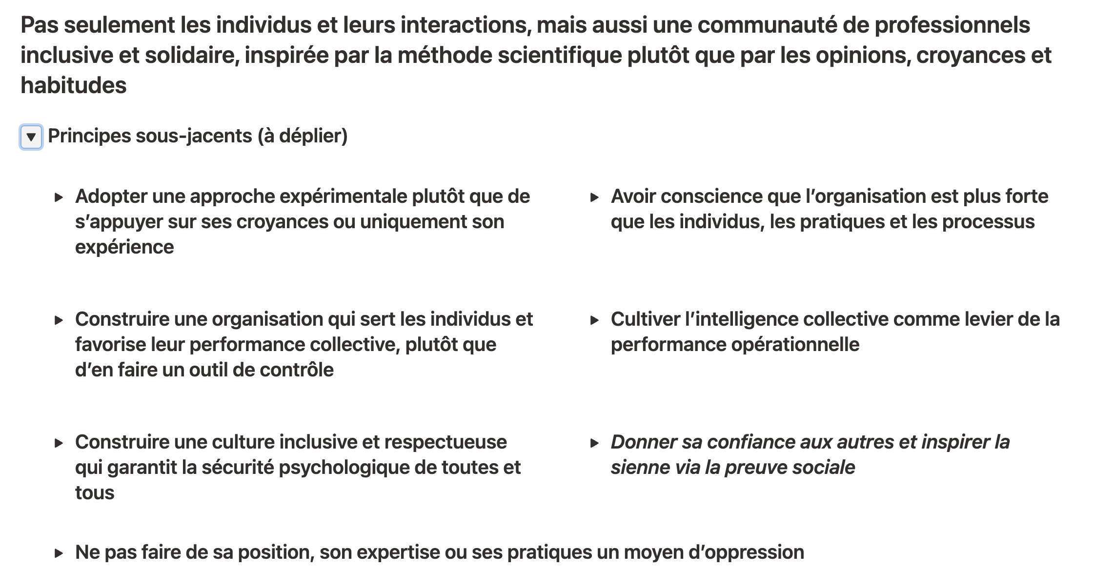 Pas seulement les individus et leurs interactions, mais aussi une communauté de professionnels inclusive et solidaire, inspirée par la méthode scientifique plutôt que par les opinions, croyances et habitudes