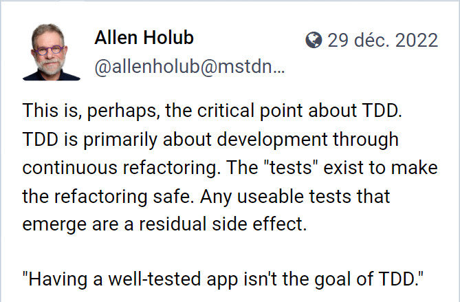 | 13:45 | Théorie: Quel est le prochain test à écrire ? - C'est quoi un test pour le TDD ? - Baby Steps (découper le problème) - TPP |