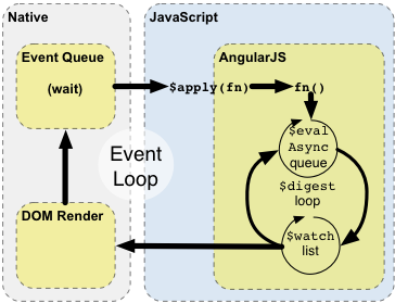 - This principle is based on dirty checking Angular scope -> every time any kind of event occurs, Angular recalculates every scope changes and updates all data -> this is called digest loop