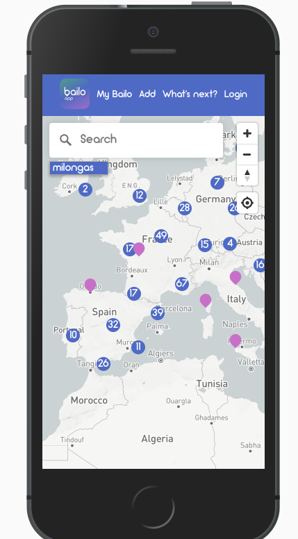 Find tango spots, practicas or schools and their information around the world either by searching for the city or by detecting your location. As a user you can add a milonga / practica / school that can be edited and deleted by an admin.