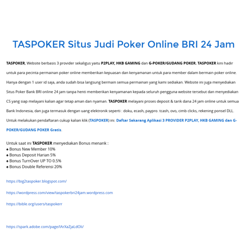 TASPOKER, Website berbasis 3 provider sekaligus yaitu P2PLAY, HKB GAMING dan G-POKER/GUDANG POKER. TASPOKER kini hadir untuk para pecinta permainan poker online memberikan kepuasan dan kenyamanan untuk para member dalam bermain poker online. Hanya dengan 1 user id saja, anda sudah bisa langsung bermain semua permainan yang kami sediakan. Website ini juga menyediakan Situs Poker Bank BRI online 24 jam tanpa henti memberikan kenyamanan kepada seluruh pengguna website tersebut dan menyediakan CS yang siap melayani kalian agar tetap aman dan nyaman. TASPOKER melayani proses deposit & tarik dana 24 jam online untuk semua Bank Indonesia, dan juga termasuk dengan uang elektronik seperti : doku, ecash, paypro. tcash, ovo, cimb clicks, rekening ponsel DLL.