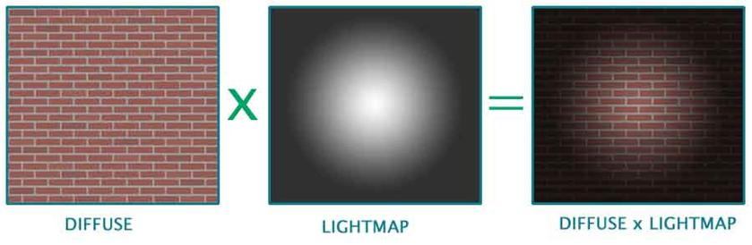 - At runtime, just use multitexturing and multiply diffuse texture sample with lightmap texture sample