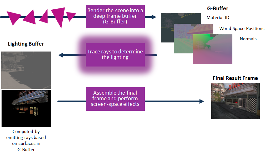 - Render frame, ray trace only what's accumulated in the G-buffer and not entire scene