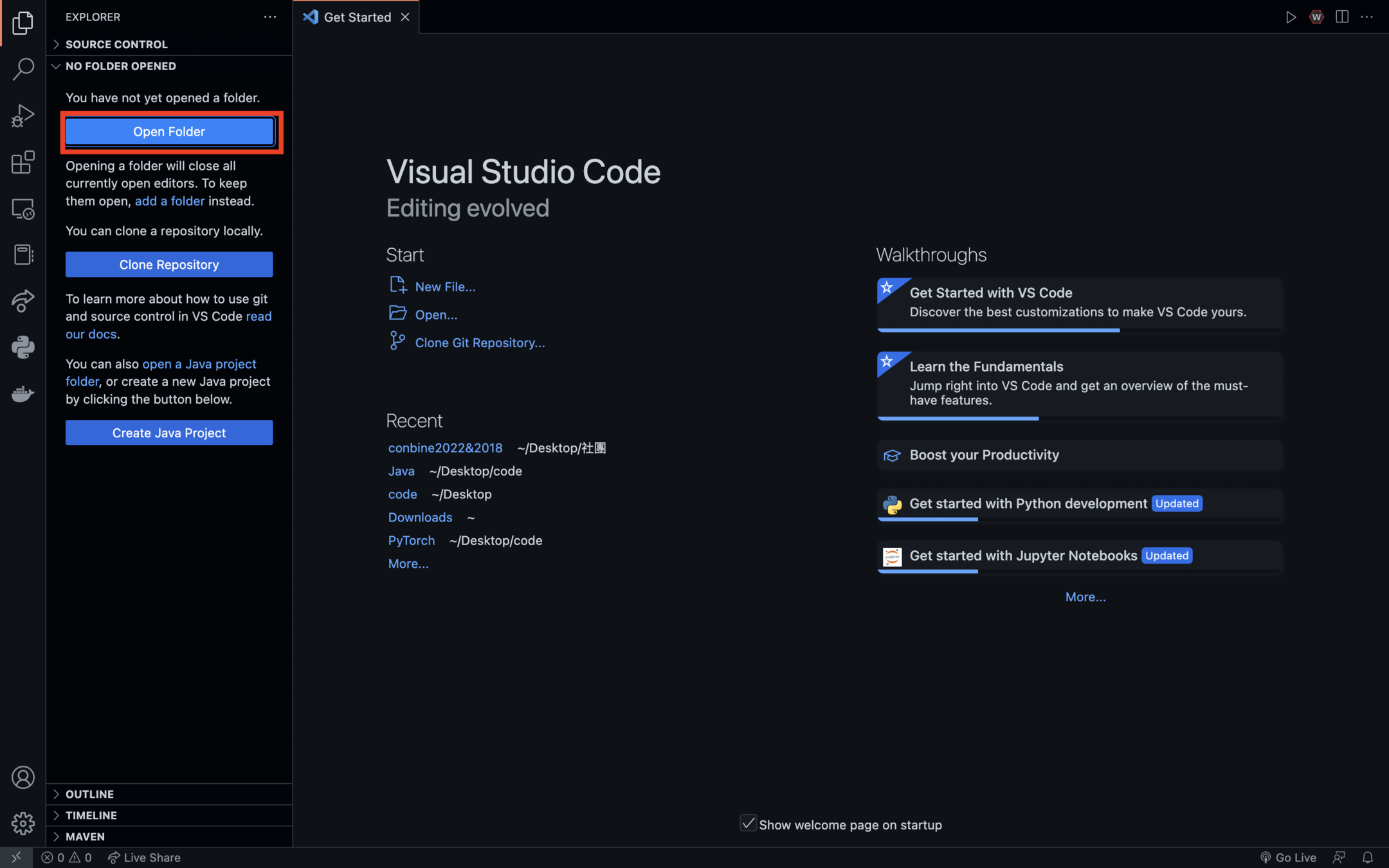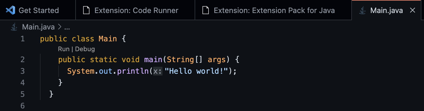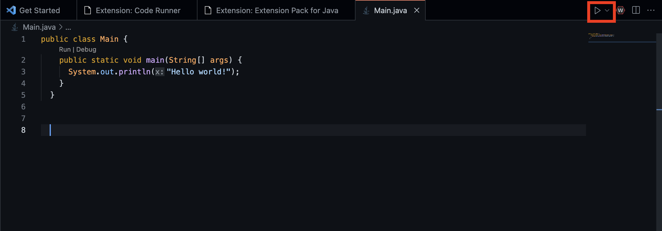 點選右上角圖示執行程式,若順利執行並在下方出現Hello world!就代表環境建立成功了