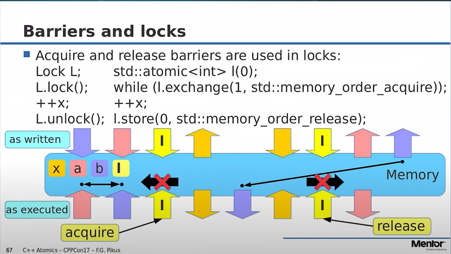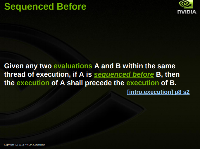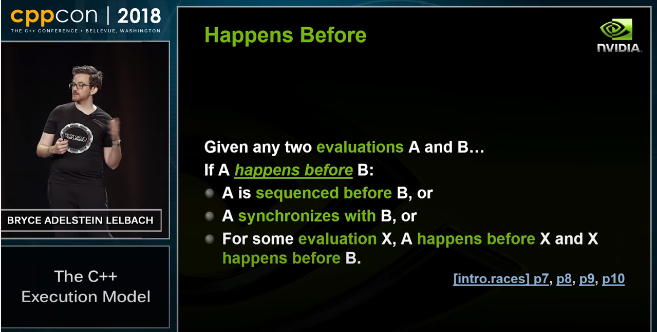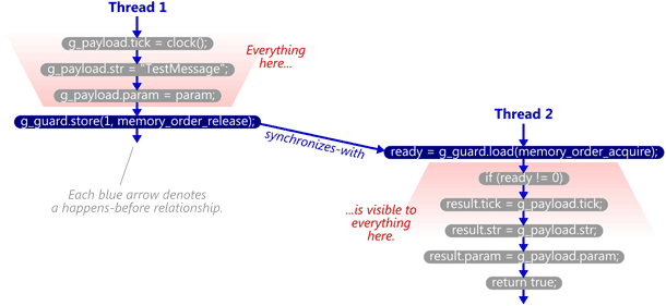 int value; std::atomic<bool> ready; void thread1() { value = 2; // non-atomic store ready = true; } void thread2() { if (ready) { // synchronizes-with relationship assert(value == 2); // never fails } }