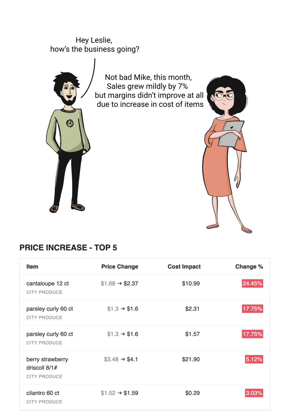 Top 3 cost impact items are x,y,z. Top 3 increasing items are a,b,c. Top 3 decreasing items are k,l,m.