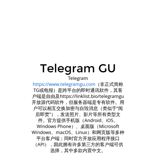 Telegram https://www.telegramgu.com(非正式简称TG或电报)是跨平台的即时通讯软件,其客户端是自由及开放源代码软件,但服务器端是专有软件。用户可以相互交换加密与自毁消息(类似于“阅后即焚”),发送照片、影片等所有类型文件。官方提供手机版(Android、iOS、Windows Phone)、桌面版(Microsoft Windows、macOS、Linux)和网页版等多种平台客户端;同时官方开放应用程序接口(API),因此拥有许多第三方的客户端可供选择,其中多款内置中文。