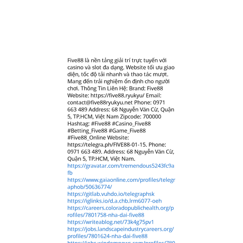 Website: https://telegra.ph/FIVE88-01-15. Five88 là nền tảng giải trí trực tuyến với casino và slot đa dạng. Website tối ưu giao diện, tốc độ tải nhanh và thao tác mượt. Mang đến trải nghiệm ổn định cho người chơi. Thông Tin Liên Hệ: Brand: Five88 W