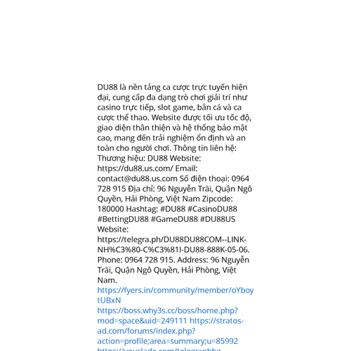 Website: https://telegra.ph/DU88DU88COM--LINK-NH%C3%80-C%C3%81I-DU88-888K-05-06. DU88 là nền tảng ca cược trực tuyến hiện đại, cung cấp đa dạng trò chơi giải trí như casino trực tiếp, slot game, bắn cá và ca cược thể thao. Website được tối ưu tốc độ,