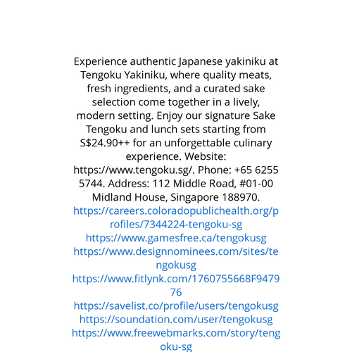 Website: https://www.tengoku.sg/. Experience authentic Japanese yakiniku at Tengoku Yakiniku, where quality meats, fresh ingredients, and a curated sake selection come together in a lively, modern setting. Enjoy our signature Sake Tengoku and lunch s