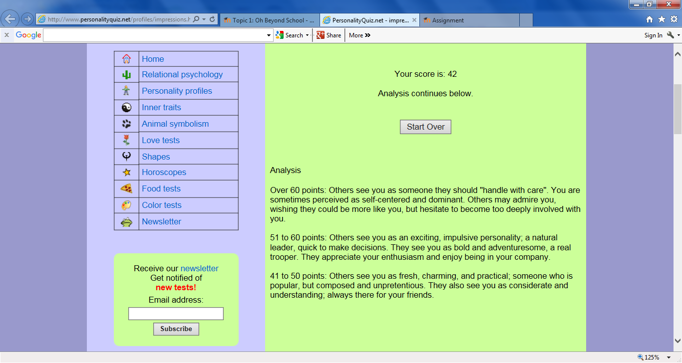 Throughout the process of quizzes and research for this assignment, it has provided a clear understanding of the person I am. All the quiz results and questions I have answered, make me unique in my own way. I am proud to be the person I am today, and am thankful for everyone in my life, who have helped me along the way.