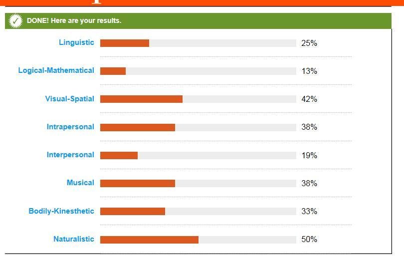 When I took the intelligence strength quiz I scored highest with Naturalistic, Visual Spatial, and Musical. All three of those results are true, but being naturalistic came back with a 50% score. When I create art I will sometimes use natures belongings to create a piece. I used pieces of bark to make a bear on a canvas, in my last art project.