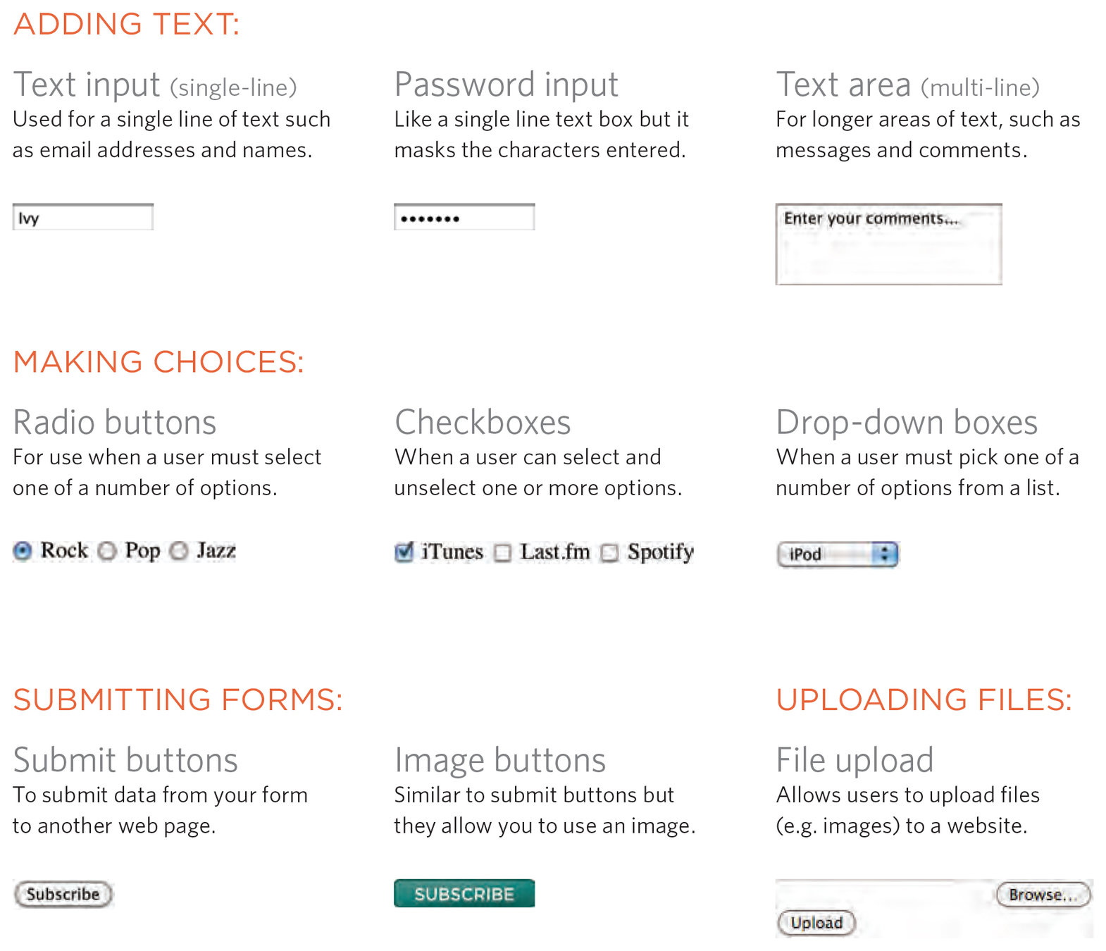 </form>Because it requires programming language knowledge to process forms, we are only going to lightly touch on how to set these up in HTML.