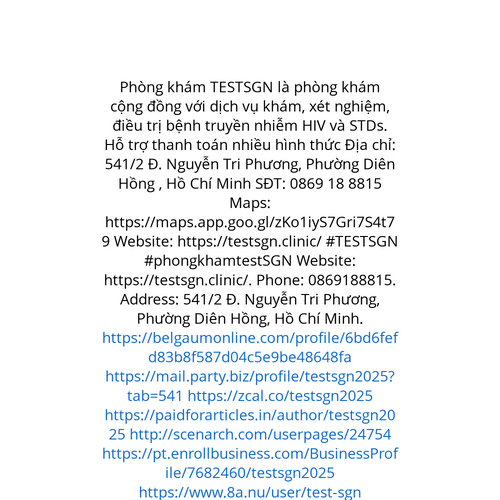 Website: https://testsgn.clinic/. Phòng khám TESTSGN là phòng khám cộng đồng với dịch vụ khám, xét nghiệm, điều trị bệnh truyền nhiễm HIV và STDs. Hỗ trợ thanh toán nhiều hình thức Địa chỉ: 541/2 Đ. Nguyễn Tri Phương, Phường Diên Hồng , Hồ Chí Minh S