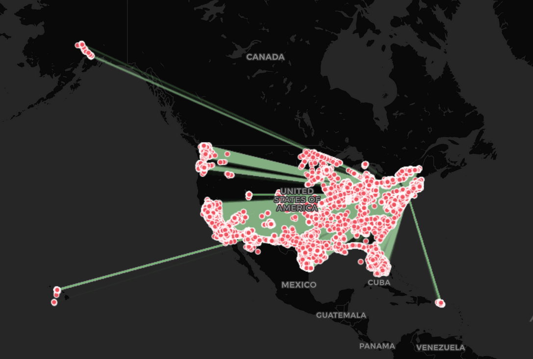 Realizamos visualización de Vuelos con origen Nueva York (-73.9919,40.6807)