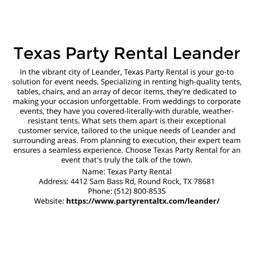 https://www.partyrentaltx.com/leander/ Texas Party Rental is Leander's go-to for event essentials. Specializing in tents, tables, chairs, and decor, they make any occasion unforgettable.