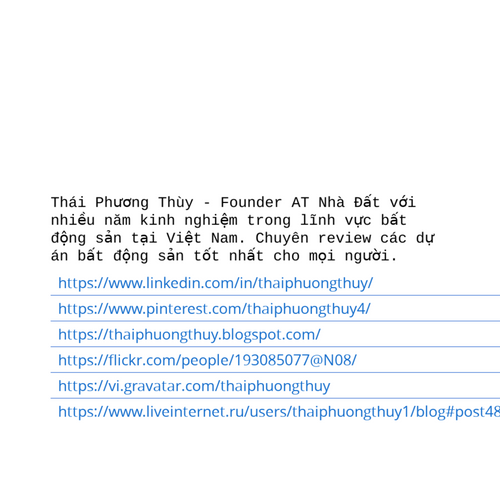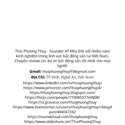 Thái Phương Thùy - Chuyên review các dự án bất động sản trên AT Nhà Đất. Gmail: thaiphuongthuy93@gmail.com Địa Chỉ: TP Vinh, Nghệ An, Việt Nam https://www.linkedin.com/in/thaiphuongthuy/ https://www.pinterest.com/thaiphuongthuy4/