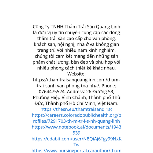 Website: https://thamtraisanquanglinh.com/tham-trai-sanh-van-phong-toa-nha/. Công Ty TNHH Thảm Trải Sàn Quang Linh là đơn vị uy tín chuyên cung cấp các dòng thảm trải sàn cao cấp cho văn phòng, khách sạn, hội nghị, nhà ở và không gian trang trí. Với