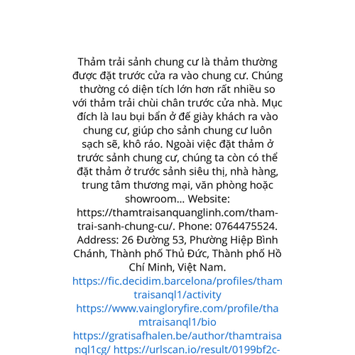 Website: https://thamtraisanquanglinh.com/tham-trai-sanh-chung-cu/. Thảm trải sảnh chung cư là thảm thường được đặt trước cửa ra vào chung cư. Chúng thường có diện tích lớn hơn rất nhiều so với thảm trải chùi chân trước cửa nhà. Mục đích là lau bụi b
