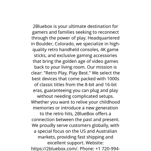 Website: https://2bluebox.com/. 2Bluebox is your ultimate destination for gamers and families seeking to bond through the power of play. Headquartered in Boulder, Colorado, we focus on premium retro handheld consoles, 4K game sticks, and exclusive ga