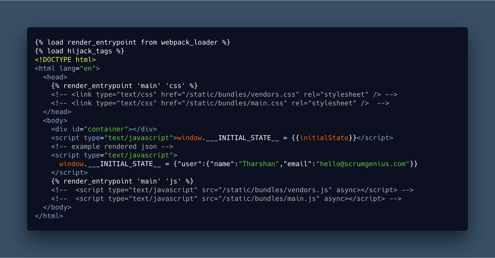 A html template renders dynamic content. Loads css and js. The context/state is passed in from the backend, and set JSON value to window.___INITIAL_STATE__