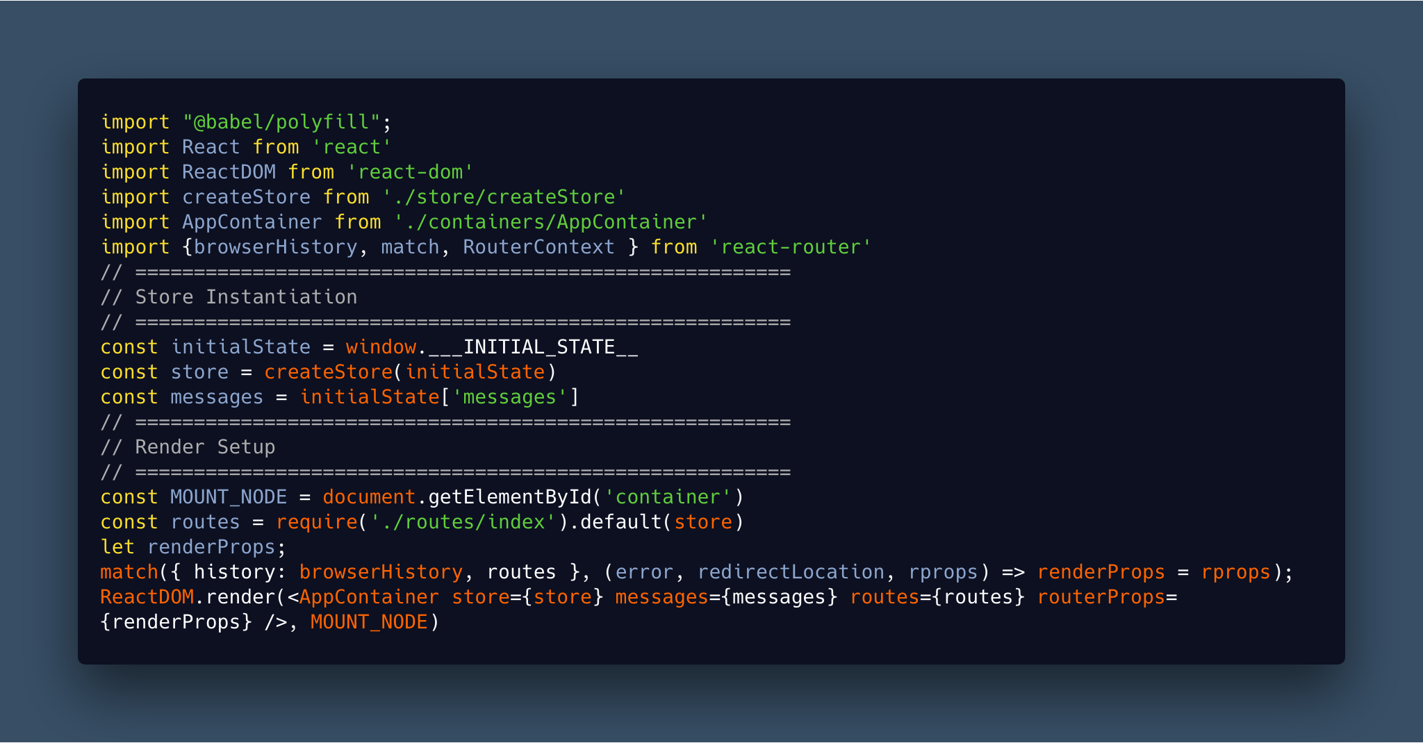 - Loaded through JS bundle in single index.html page.