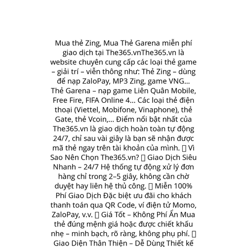 Website: https://the365.vn. Mua thẻ Zing, Mua Thẻ Garena miễn phí giao dịch tại The365.vnThe365.vn là website chuyên cung cấp các loại thẻ game – giải trí – viễn thông như: Thẻ Zing – dùng để nạp ZaloPay, MP3 Zing, game VNG… Thẻ Garena – nạp game Liê