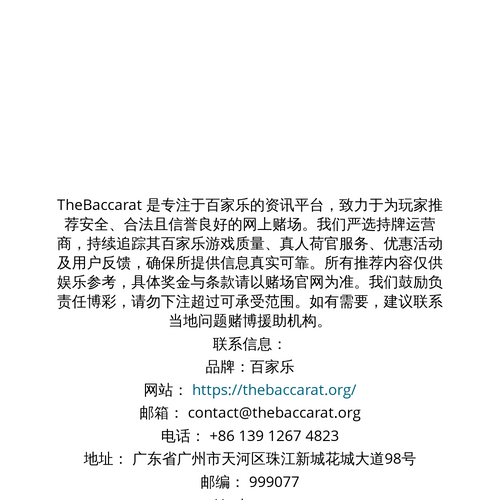 TheBaccarat 是专注于百家乐的资讯平台,致力于为玩家推荐安全、合法且信誉良好的网上赌场。我们严选持牌运营商,持续追踪其百家乐游戏质量、真人荷官服务、优惠活动及用户反馈,确保所提供信息真实可靠。所有推荐内容仅供娱乐参考,具体奖金与条款请以赌场官网为准。我们鼓励负责任博彩,请勿下注超过可承受范围。如有需要,建议联系当地问题赌博援助机构。 联系信息: 品牌:百家乐 网站: https://thebaccarat.org/ 邮箱: contact@thebaccarat.org 电话: +86 139 1267 4823 地址: 广东省广州市天河区珠江新城花城大道98号 邮编: 999077 Hashtag: #百家乐 #thebaccaratorg #线上百家乐 #真人百家乐 #注册送彩金