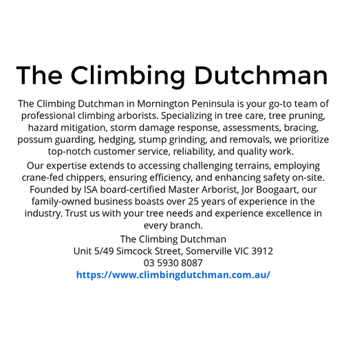 https://www.climbingdutchman.com.au/ The Climbing Dutchman in Mornington Peninsula is your go-to team of professional climbing arborists. Specializing in tree care, tree pruning, hazard mitigation, storm damage response, assessments, bracing ETC