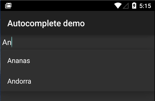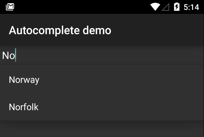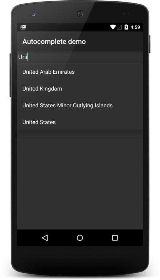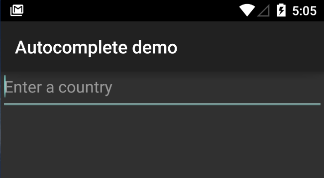 countryAutoCompleteTextView.setAdapter(countriesAdapter);Nøyaktig det samme som ListView