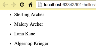 'Sterling Archer', 'Malory Archer', 'Lana Kane', 'Algernop Krieger'];