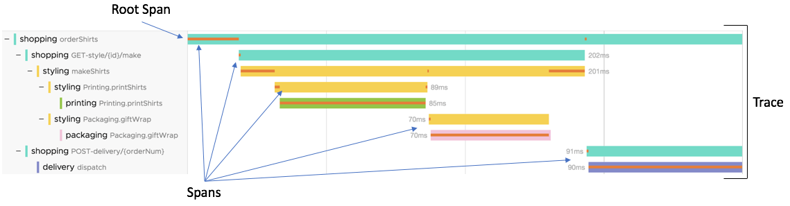➝ Root Span: The first span in a trace—often the inbound request handler.
