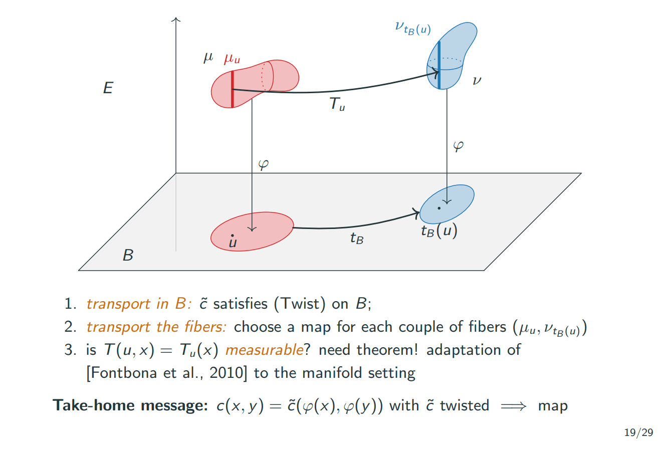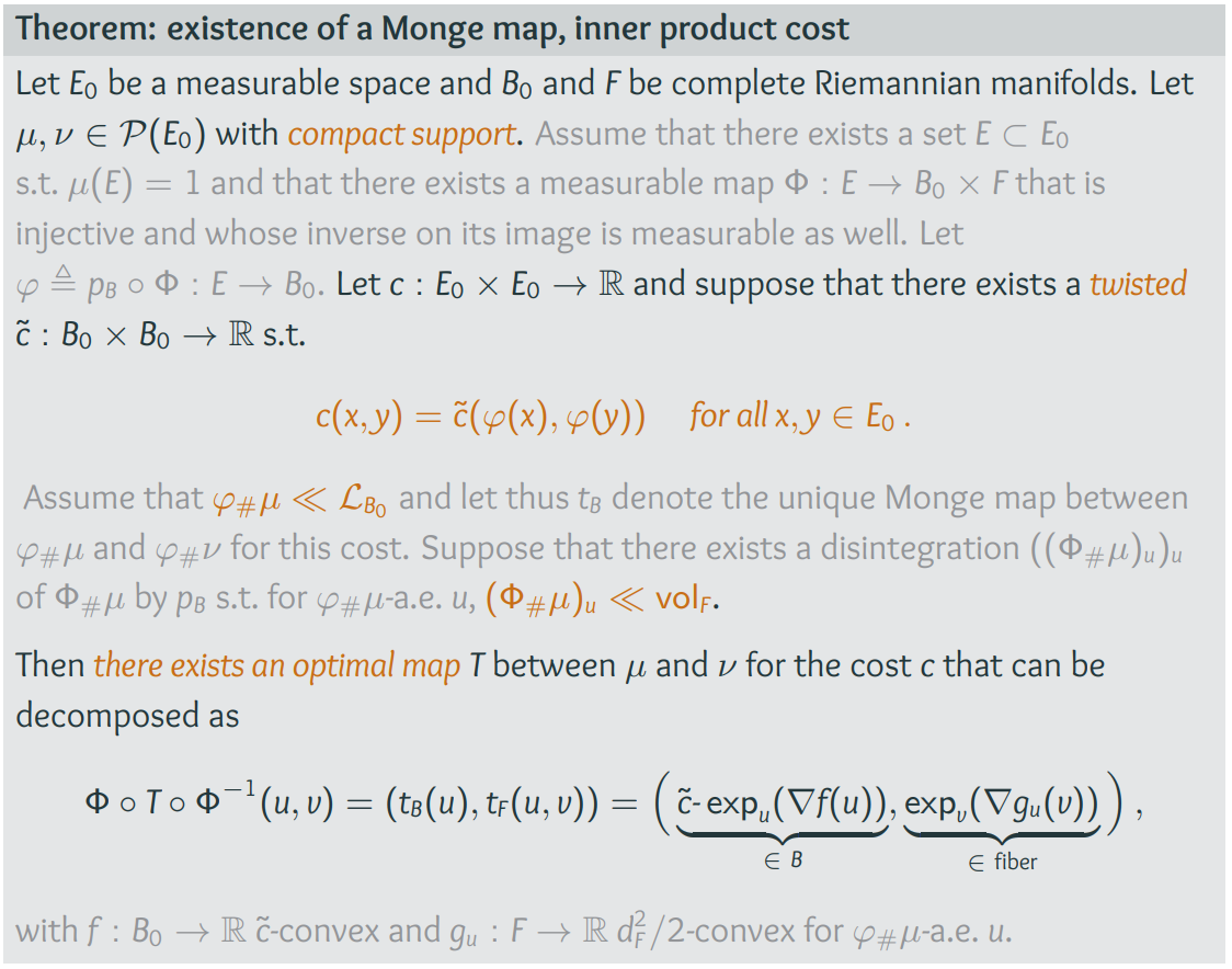 "Let \(\mu,\nu\in\mathcal P(E)\). If we can send \(\mu\) and \(\nu\) in a space \(B\) by a map \(\varphi:E\to B\), such that \[c(x,y)=\tilde c(\varphi(x),\varphi(y))\quad\text{for all }x,y\in E\] with \(\tilde c\) a twisted cost on \(B\), then we can construct an optimal map between \(\mu\) and \(\nu\)."