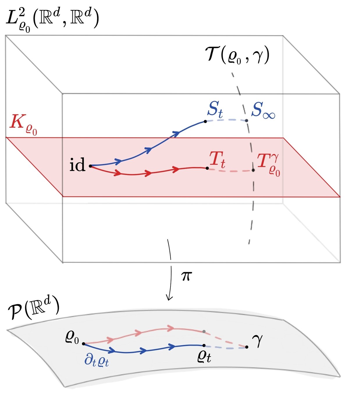 The idea: lift the functional \(D\) in the simple (Hilbert) space \(L^2_{\varrho_0}(\mathbb R^d,\mathbb R^d)\), and constrain the flow to stay in the closed convex set \(K\) of optimal transport maps.