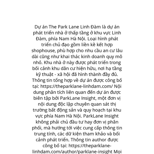 Website: https://theparklane-linhdam.com/. Dự án The Park Lane Linh Đàm là dự án phát triển nhà ở thấp tầng ở khu vực Linh Đàm, phía Nam Hà Nội. Loại hình phát triển chủ đạo gồm liền kề kết hợp shophouse, phù hợp cho nhu cầu an cư lâu dài cũng như kh
