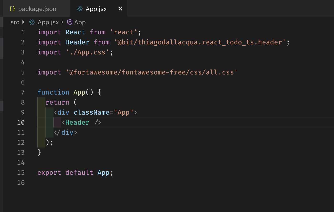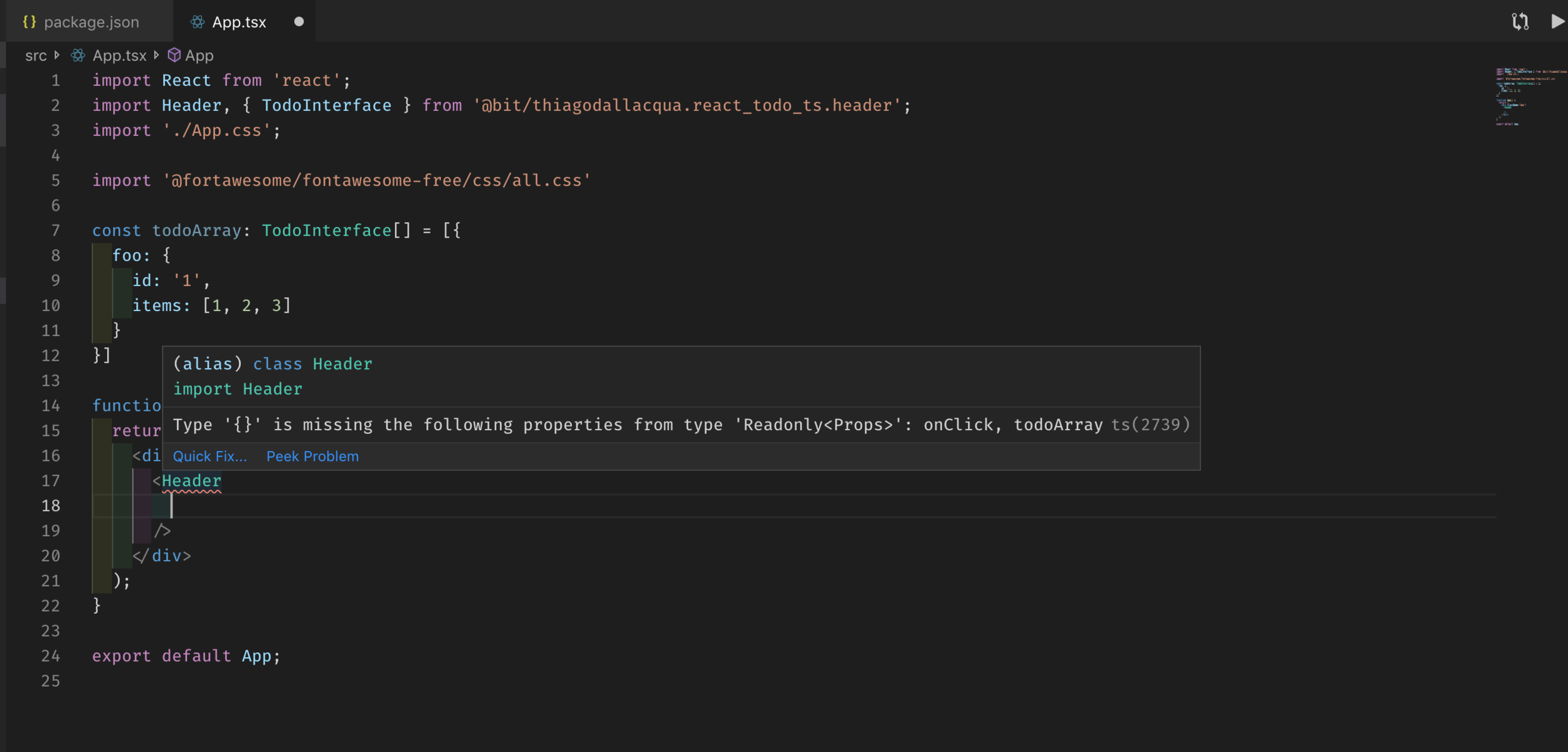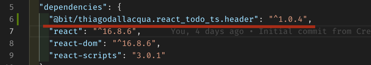 Package.json file after running "npm install @bit/thiagodallacqua.react_todo_ts.header"