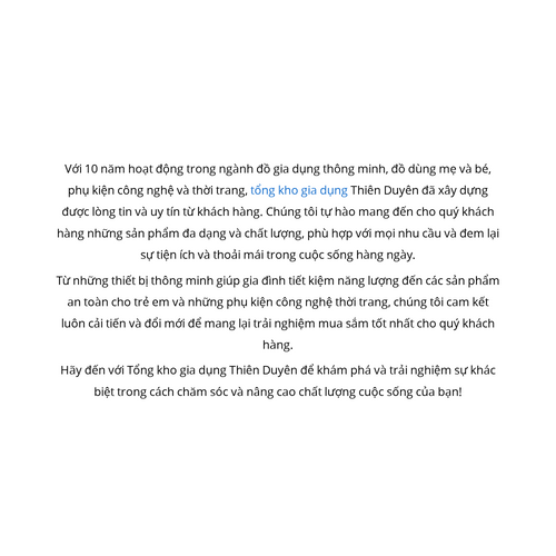 Với kinh nghiệm hơn 10 năm trong ngành đồ gia dụng thông minh, đồ dùng mẹ và bé, phụ kiện công nghệ và thời trang, Tổng kho gia dụng Thiên Duyên đã trở thành địa chỉ tin cậy cho các gia đình tại Việt Nam.