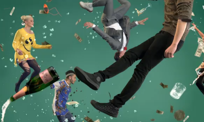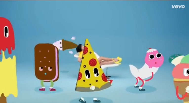 A lot of animation has been used in this music video which is quite unconventional. Even though some music videos use a lot of animation, they tend to try and keep it quite realistic. However this music video is very abstract and has animated different animals and objects onto the video such as food and an ice cream ‘twerking’. This is perhaps to give it a younger, more unique feel as well as add that comedy aspect to it. Slow motion has also been used which highlights people moving slowly in the air, perhaps indicating a party type atmosphere.