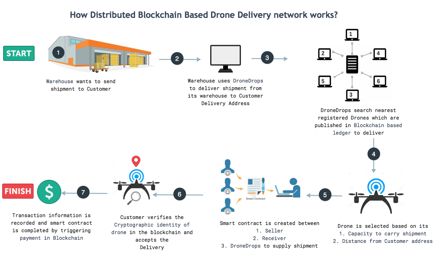 In Delivery Industry - 28% of the total cost to deliver a business comes from the last-mile. Efficiency is a challenge in supply chain, but when talking about the last mile, especially with regards to same-day/hourly delivery the challenges are enormous. Also with these on-demand Rapid requests, maintaining an open system of records is a key challenge. With large number of drone delivery companies starting to build, identity of drone is also a challenge which should be addressed.