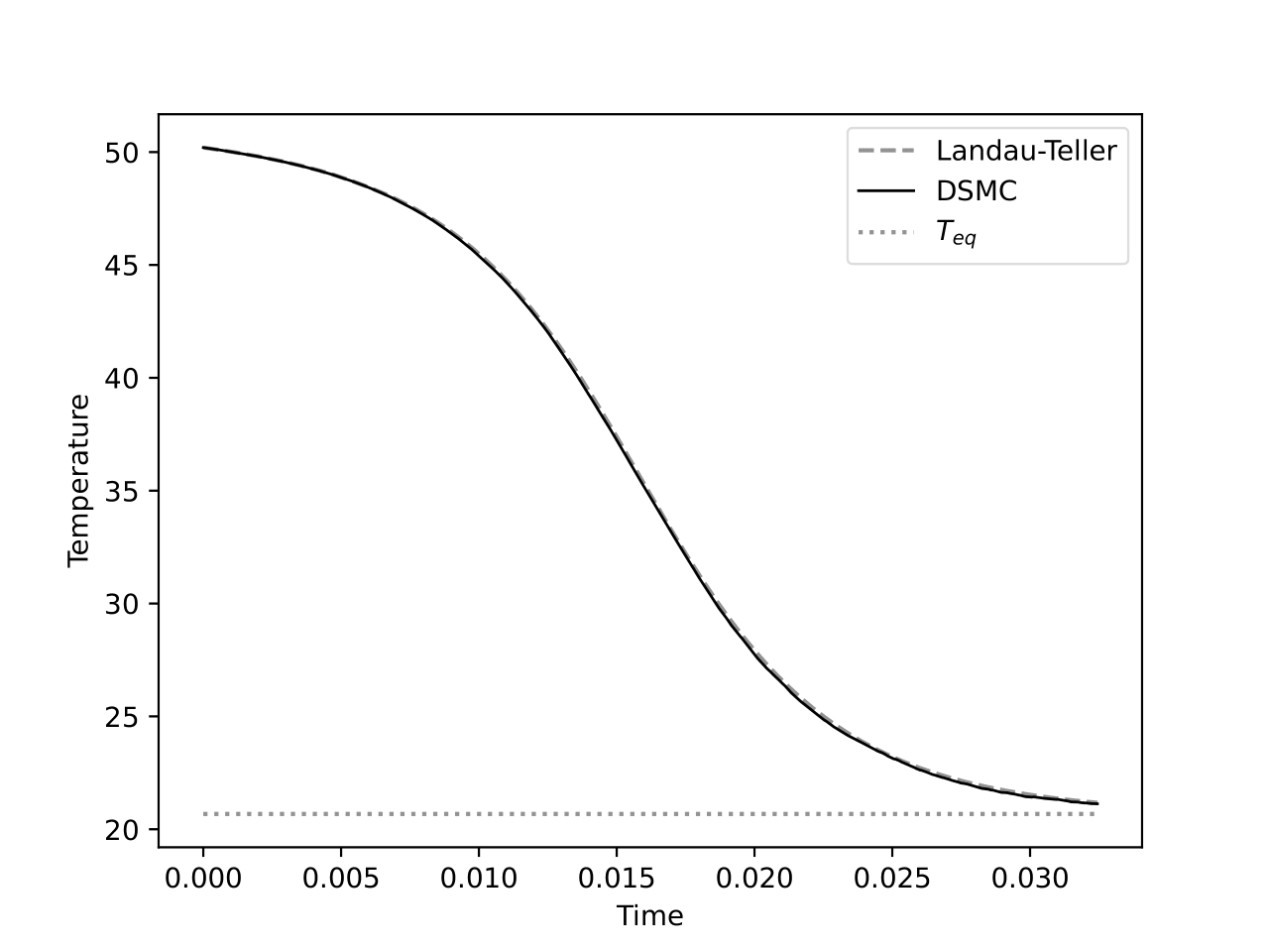 - the kinetic (\(\textcolor{blue}{T_k}\)) and internal (\(\textcolor{blue}{T_i}\)) temperatures relax towards each other, (almost) following Landau-Teller ODE system \((LT)\)