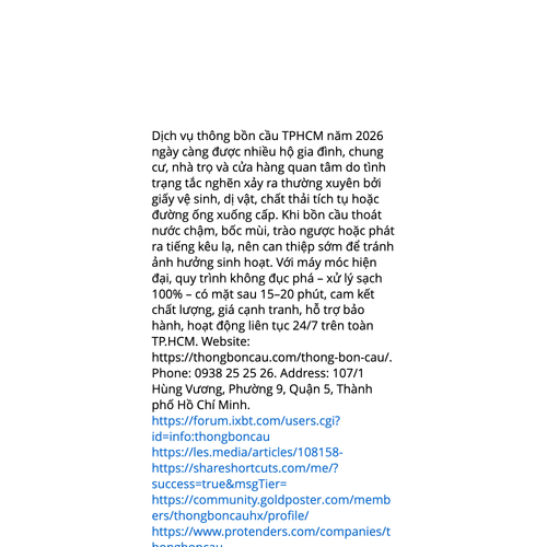 Website: https://thongboncau.com/thong-bon-cau/https://thongboncau.com/thong-bon-cau/ Thông bồn cầu TP.HCM 2026 trở nên phổ biến với mọi đối tượng sử dụng do bồn cầu dễ bị nghẹt bởi nguyên nhân như vật cứng, chất thải và đường ống hư hỏng. Khi bồn cầu thoát nước chậm, bốc mùi, trào ngượ