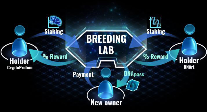 After the centralized collection of 3,200 NFTs, each new DNArt can only be created at the Breeding lab. This is the starting point of a decentralized model developed to sustain the community and the project.
