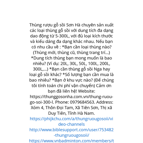 Website: https://thunggosonha.com.vn/thung-ruou-go-soi-300-l. Thùng rượu gỗ sồi Sơn Hà chuyên sản xuất các loại thùng gỗ sồi với dung tích đa dạng dao động từ 5-300L, với đủ loại kích thước và kiểu dáng đa dạng khác nhau. Nếu bạn có nhu cầu về : *B