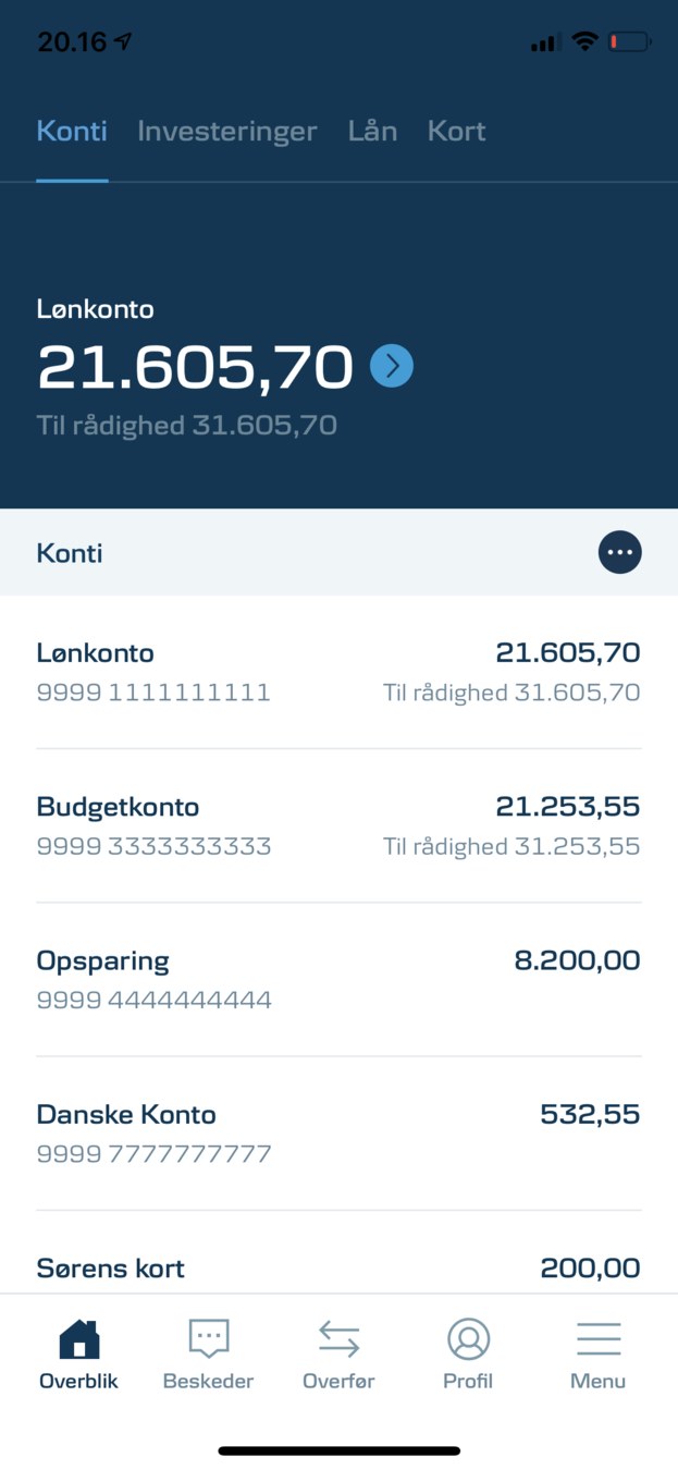 - Combined readout “Lønkonto 21.605,70 9999 1111111111 til rådighed 31.605,70. Button".