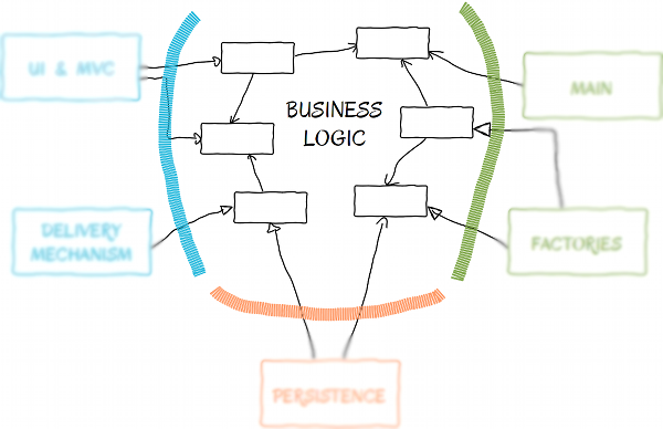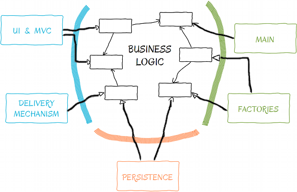 Dependencies point only toward the business logic.