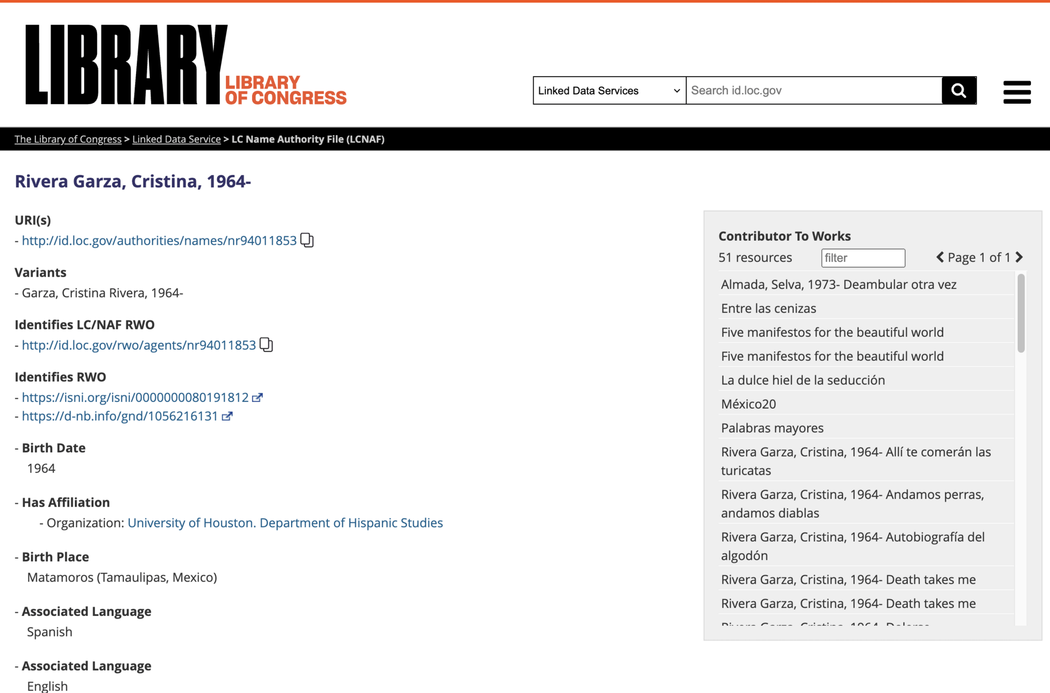 Rivera Garza, Cristina, 1964- URI: http://id.loc.gov/authorities/names/nr94011853