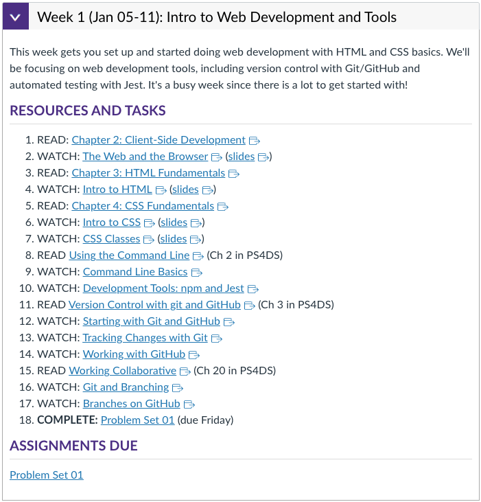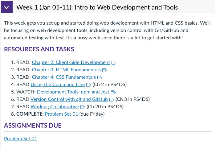 The course schedule has an ordered list of resources and tasks. The best way to approach this: