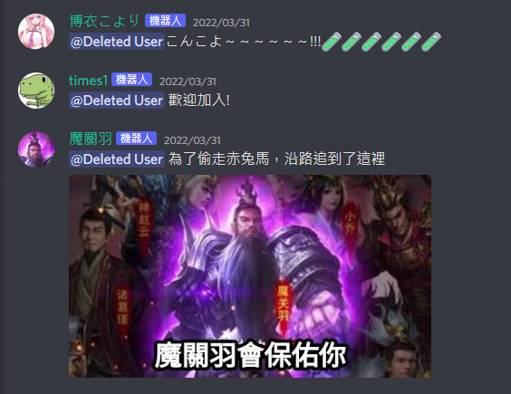 await joinchannel.send(member.mention+' 歡迎加入!') #在特定頻道發言